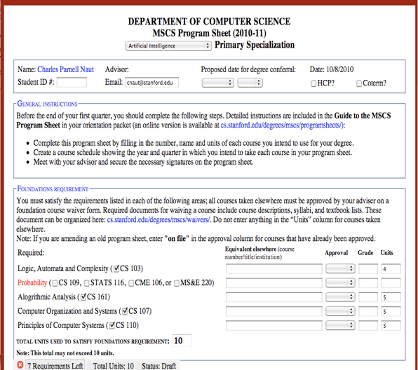 Note that rules processed by Complaw systems are not restricted to governmental rules. They can equally well be the policies of universities and corporations (e.g. travel expense reimbursement, product configuration worksheets, and pricing rules). The program sheet below is an example. Students at Stanford use worksheets like this one to choose courses that fulfill all program requirements. (a) The worksheet shows all requirements explicitly - appearing in red until those requirements are satisfied, after which they turn blue. (b) It calculates units in accordance with departmental policies, ensuring no double counting. (c) It enforces that all prerequisite classes are taken. (d) It prevents students from taking mutually exclusive courses. And so forth.